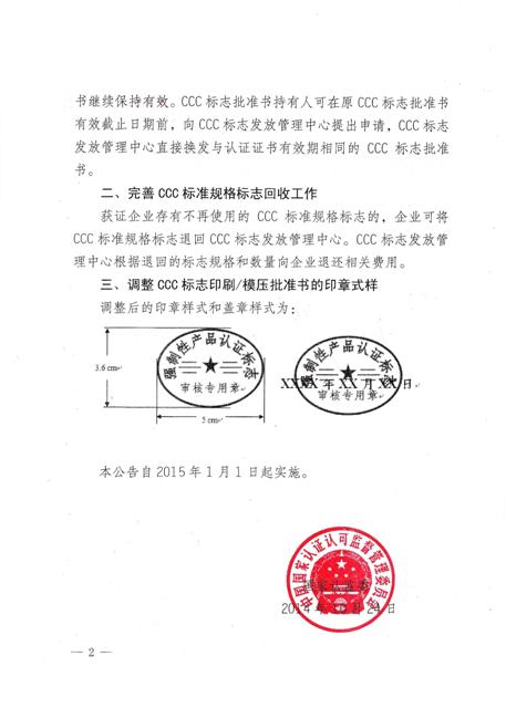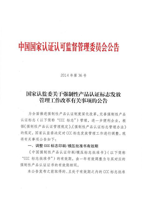 國家認監委為全面推進強制性產品認證制度深化改革,完善強制性產品認證標志(以下簡稱“CCC標志”)管理,進一步便利企業,決定對CCC標志發放管理工作進行調整。將調整CCC標志印刷/模壓批準書有效期,完善CCC標準規格標志回收工作。